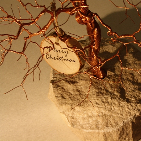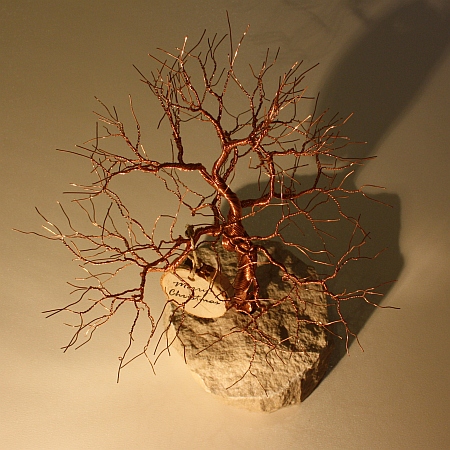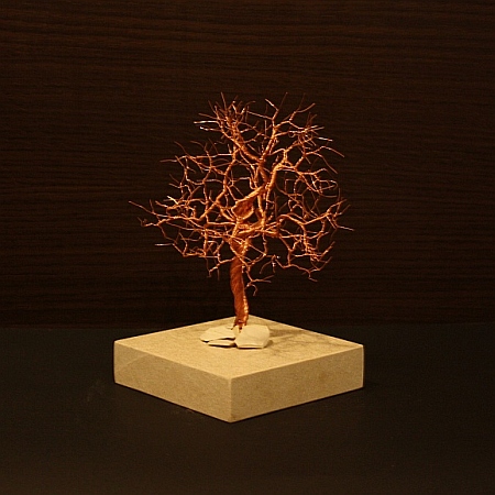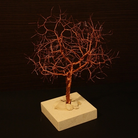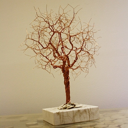 Hand twisted copper wire tree sculpture with roots mounted on precious white limestone