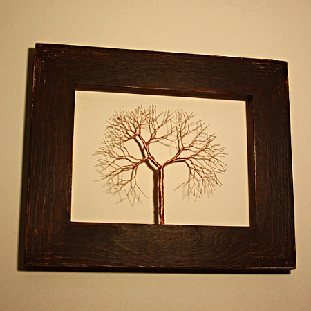 Hand twisted copper wire tree sculpture in vintage wooden frame